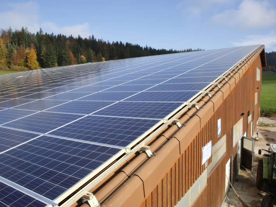 Panneaux posés à 15 cm de la couverture afin de permettre le préchauffage de l’air de séchage du foin. Pose de 30 panneaux transparents, sans production, afin de permettre un éclairage naturel de la halle.